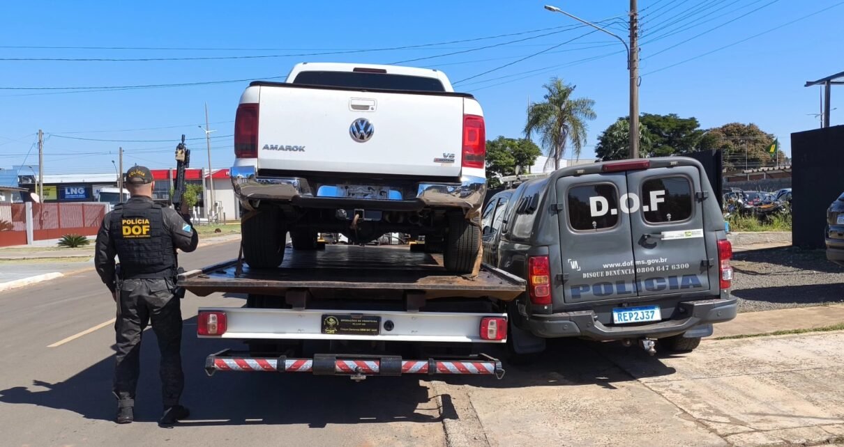 Policiais militares do DOF (Departamento de Operações de Fronteira) apreenderam, na manhã desta sexta-feira (19), uma camionete VW Amarok de cor branca. O veículo, com a numeração do chassi adulterada e a do motor, suprimida, seguia rebocado por um guincho com destino a Curitiba.
