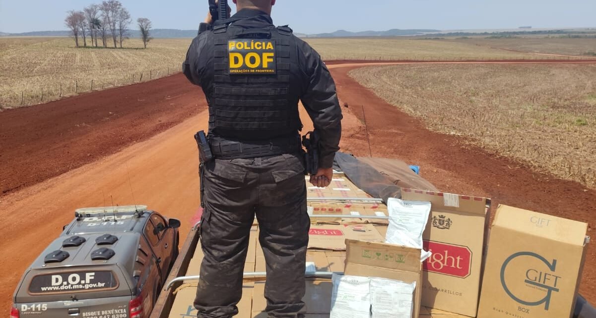 DOF apreende carreta com R$ 2,2 milhões em cigarros e agrotóxicos contrabandeados do Paraguai