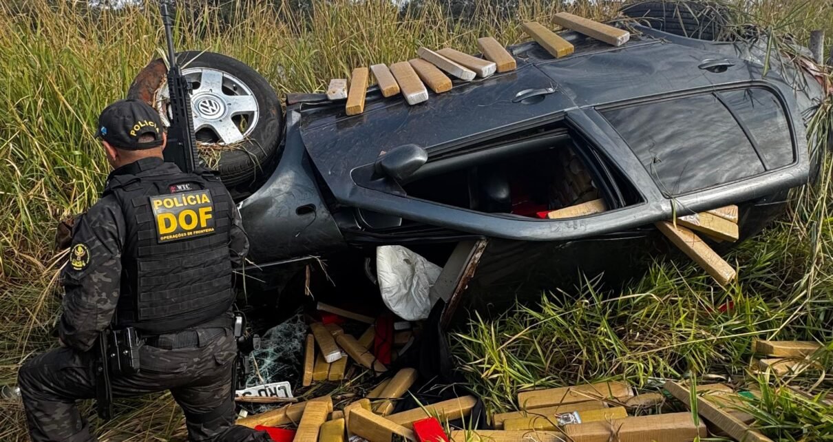 Policiais militares do DOF (Departamento de Operações de Fronteira) apreenderam nesta quarta-feira (20), em Ponta Porã, mais de 850 quilos de maconha que eram transportados em um veículo VW Golf, que capotou durante a fuga.