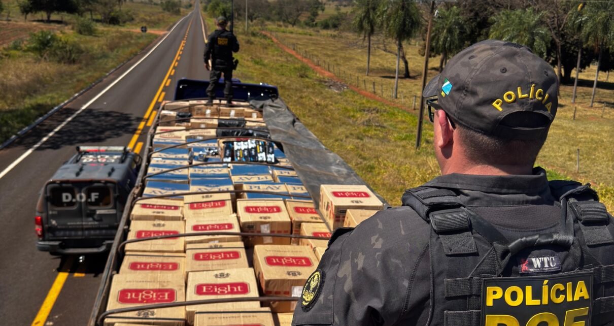 Em vistoria na carreta foram encontradas diversas caixas de cigarros de origem estrangeira, que totalizaram 12.650 pacotes. Questionado, o homem afirmou que pegou os cigarros em Maracaju e levaria até a cidade de Jacarezinho (PR).