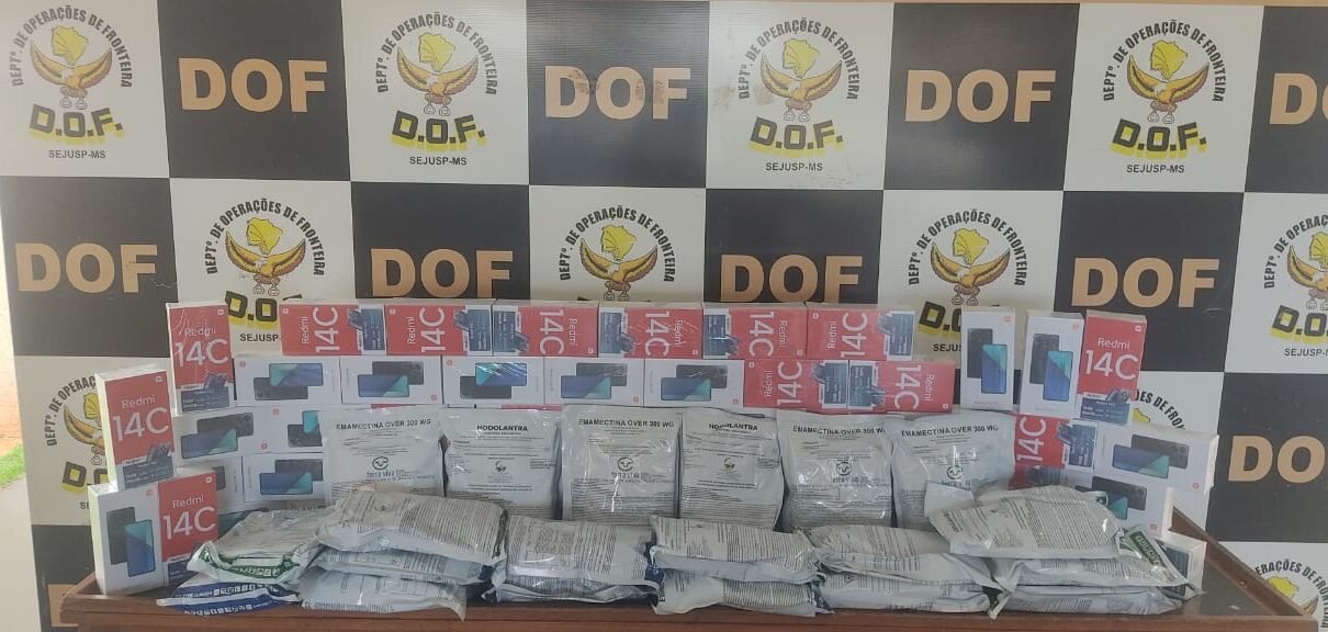 Policiais militares do DOF (Departamento de Operações de Fronteira) apreenderam nesta quinta-feira (5), em uma van, na MS-156 em Tacuru, 50 aparelhos de telefone celular e 20 quilos de defensivos agrícolas contrabandeados do Paraguai. Na ação ninguém foi preso.