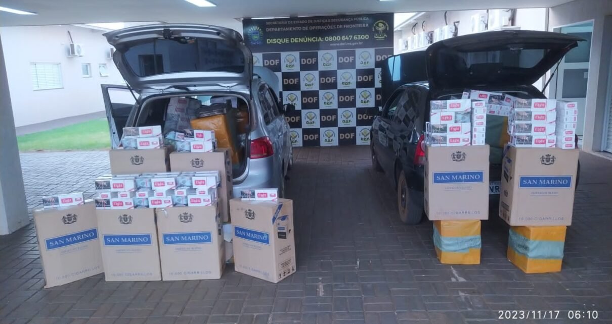 Duas ações de policiais militares do DOF (Departamento de Operações de Fronteira), nesta quinta-feira (16), no enfretamento ao contrabando e descaminho resultaram na apreensão de mais de dois mil pacotes de cigarros contrabandeados do Paraguai, além de medicamentos e diversos produtos importados do país vizinho de forma irregular. Ao todo, oito pessoas foram detidas e cinco veículos apreendidos.