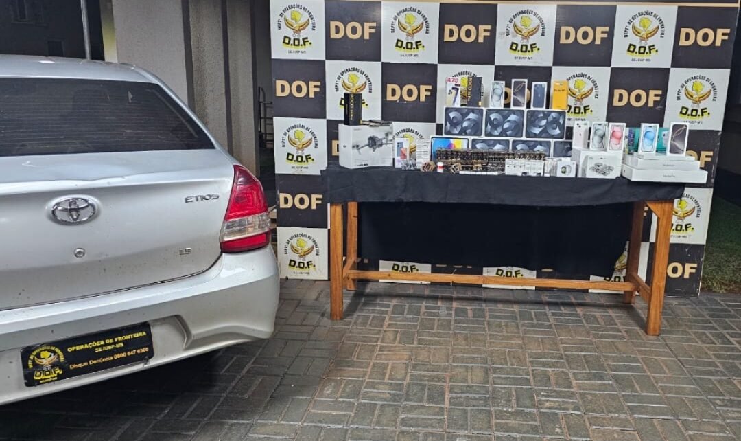 Policiais militares do DOF (Departamento de Operações de Fronteira) apreenderam nesta quinta-feira (24), em Maracaju, um veículo Toyota Etios carregado com mais de R$ 340 mil em materiais de contrabando e descaminho. Entre os produtos apreendidos estão remédios e anabolizantes. Dois homens de 25 e 46 anos foram detidos.