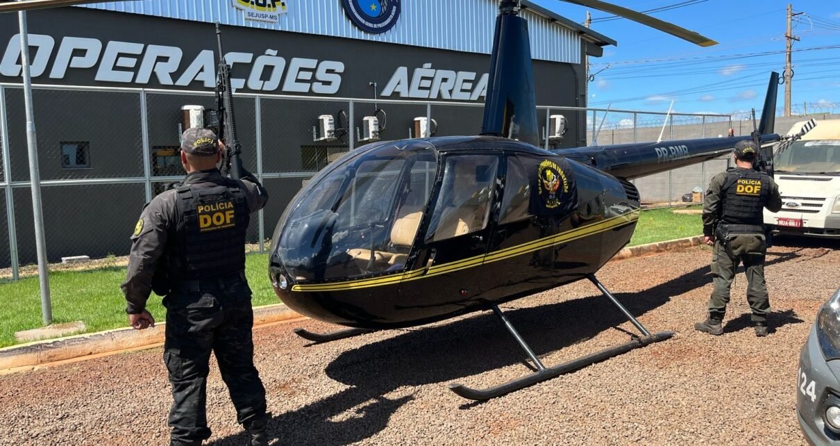 Policiais militares do Departamento de Operações de Fronteira (DOF) apreenderam, na tarde desta terça-feira (12) um helicóptero da marca Robinson modelo R44 de cor preta.