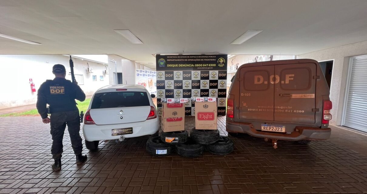 Foram apreendidos 100 pacotes de cigarros e 28 pneus para veículo de passeio. A ocorrência foi registrada e entregue na Receita Federal de Ponta Porã. O prejuízo estimado ao crime foi de R$ 32 mil.