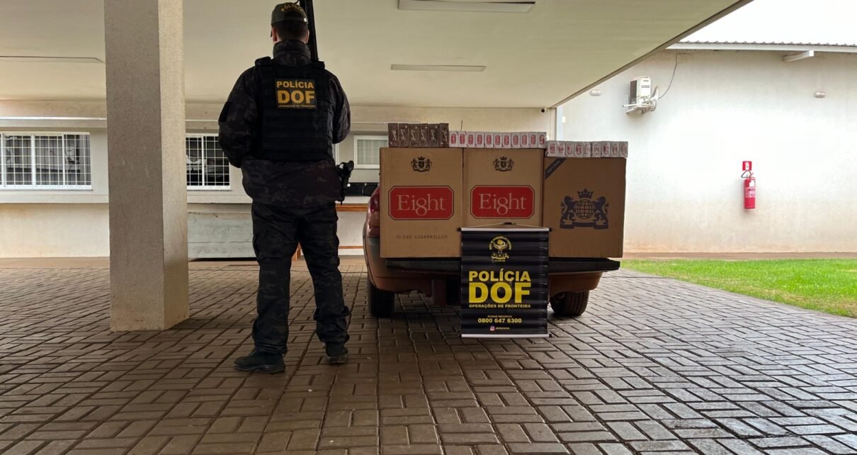 Policiais militares do DOF (Departamento de Operações de Fronteira) apreenderam, na manhã desta quinta-feira (11), um veículo GM Montana de cor preta carregado com 170 pacotes de cigarros ilegais.
