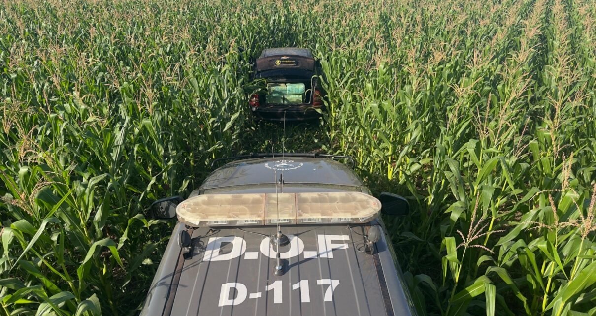 Cerca de 300 metros à frente, os policiais encontraram o veículo abandonado, com as portas abertas, em uma plantação de milho. Realizadas as buscas nas imediações, porém, nenhuma pessoa localizada.