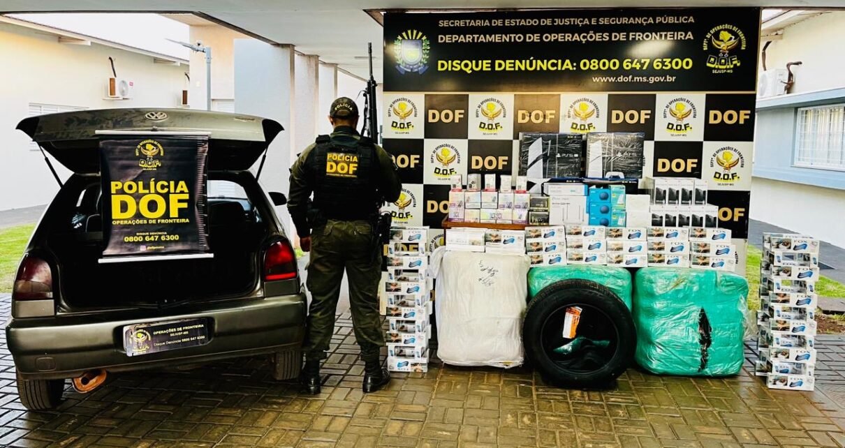 Policiais militares do Departamento de Operações de Fronteira (DOF) apreenderam na tarde desta terça-feira (3), um veículo VW Gol, de cor cinza, carregado com 150 pacotes de cigarros; 250 cigarros eletrônicos; vídeo game PS5; cartões de memória; roteadores; repetidor de Wi-Fi; pneus; e celulares. Na ação, um homem e uma mulher foram presos.